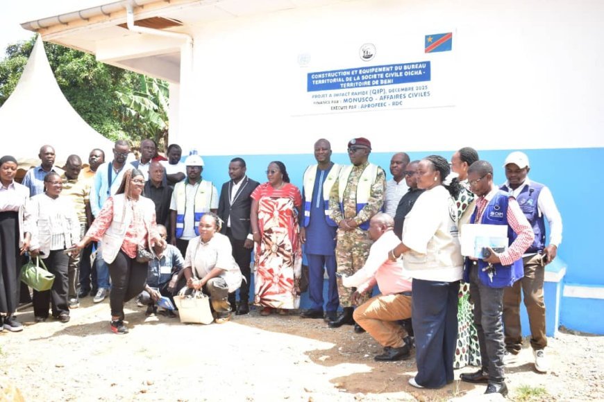 La société civile du territoire de Beni, au Nord Kivu, dispose désormais d’un bâtiment moderne financé par la MONUSCO à travers sa Section des Affaires civiles. L'infrastructure, remise officiellement le 17 février 2026 à Oicha dans le cadre d’un Projet à Impact Rapide (QIP), vient répondre au besoin de renforcer les capacités locales, prévenir les conflits communautaires et promouvoir la paix dans une région régulièrement confrontée à l’insécurité.