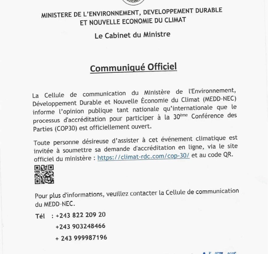 COP30-Brezil: Le Service de Communication du ministère de l'Environnement congolais lance le processus d'accréditation à travers son site internet dédié (Communiqué de presse)
