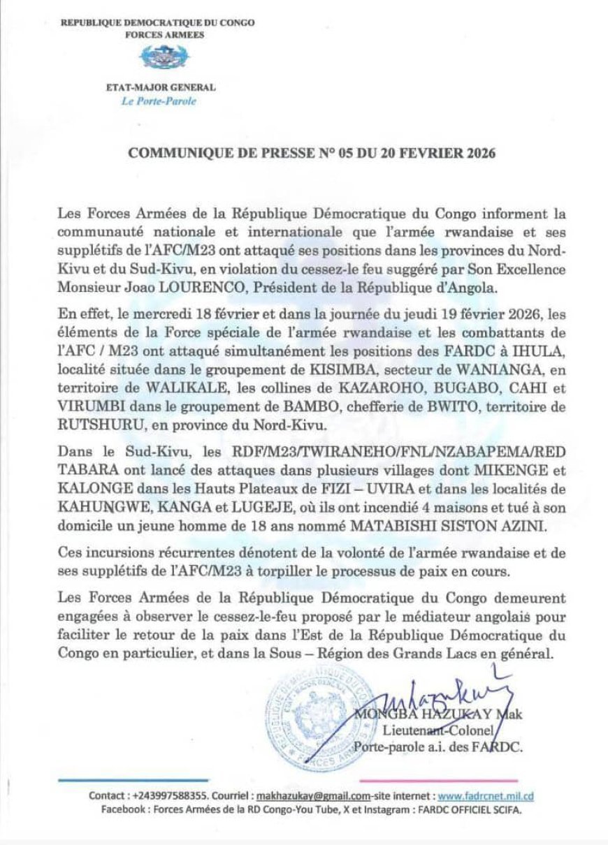 Selon le communiqué militaire, des affrontements se sont produits les 18 et 19 février 2026 dans plusieurs zones stratégiques du Nord-Kivu. Les FARDC évoquent des attaques simultanées contre leurs positions à Ihula, dans le territoire de Walikale, ainsi que sur les collines de Kazaraho, Bugabo, Cahi et Virumbi, en territoire de Rutshuru. L’armée congolaise parle d’opérations coordonnées impliquant des unités qualifiées de forces spéciales rwandaises aux côtés des combattants de l’AFC/M23.