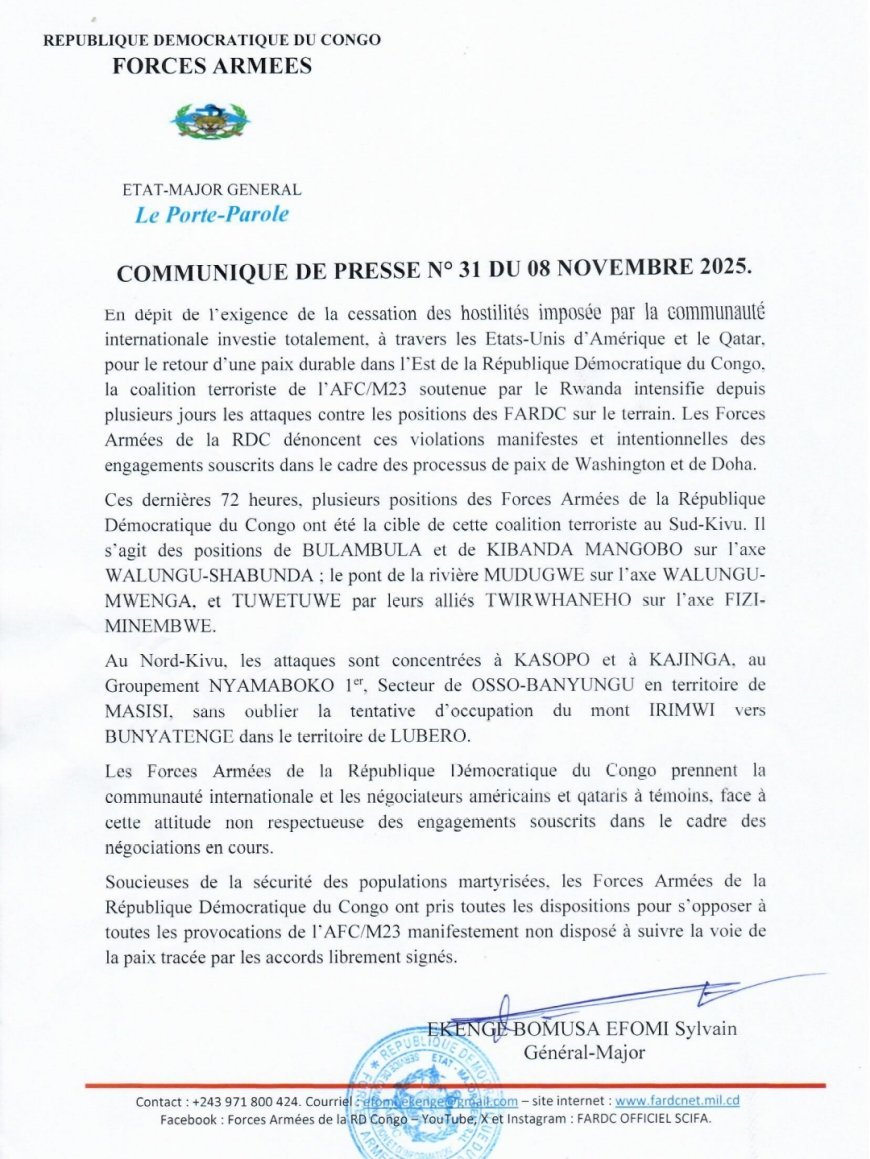 Le Porte-parole des Forces armées de la République démocratique du Congo, le Général Sylvain Ekenge s'est exprimé dans un communiqué de presse, dont la copie est parvenue à la Rédaction de www.newnarratifrdc.net, ce dimanche 09 novembre, pour dénoncer ce qu'il qualifie de provocation, les attaques répétées de la coalition terroriste AFC-M23, aux positions des FARDC.