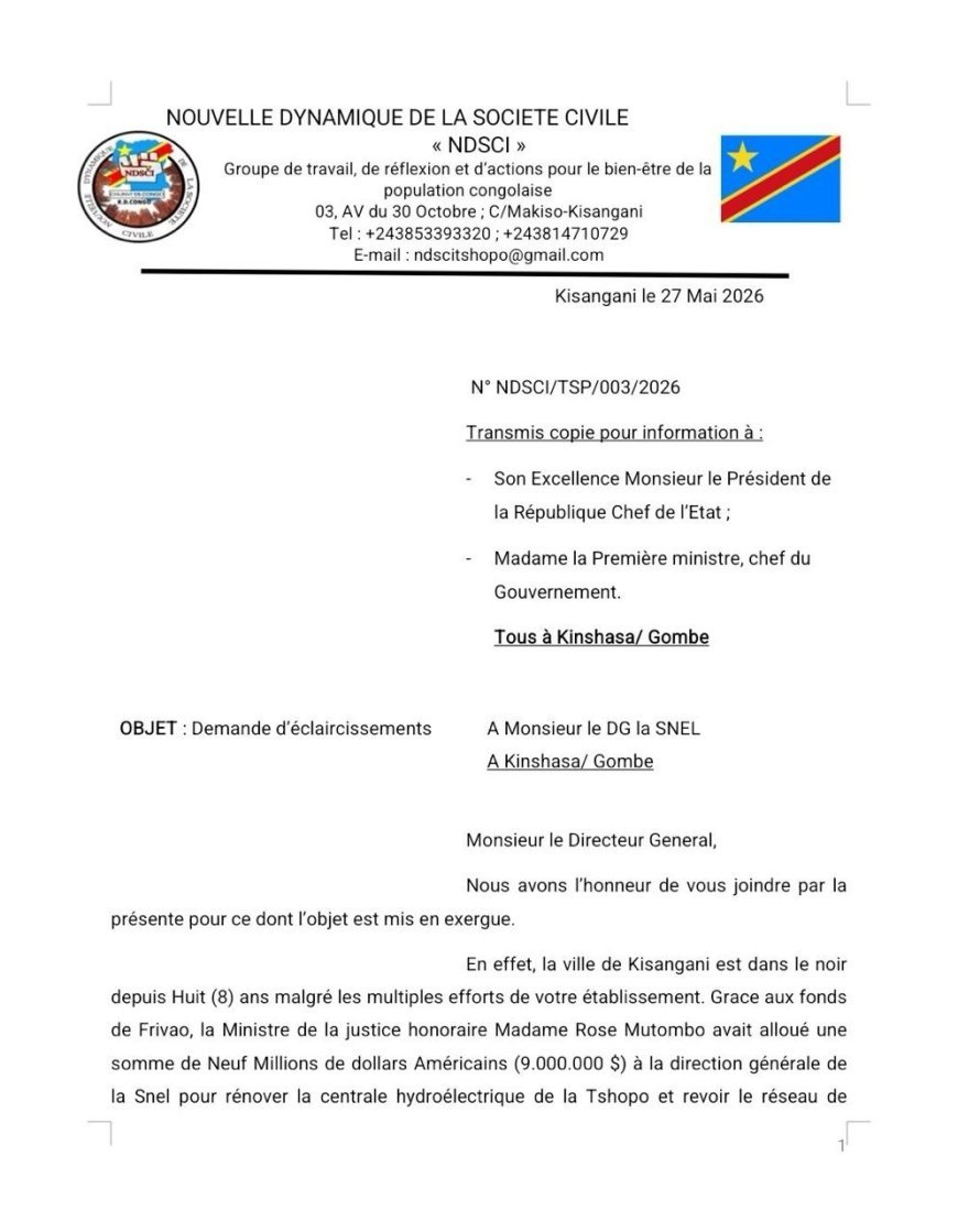La Nouvelle Dynamique de la Société Civile (NDSCI) rompt le silence sur le calvaire énergétique de Kisangani, plongée dans l'obscurité depuis huit ans. Dans une correspondance adressée à la direction générale de la SNEL, l'organisation citoyenne demande officiellement des clarifications sur l'usage des 9 millions de dollars américains alloués en 2023 par les fonds FRIVAO. Ce financement, destiné initialement à la réhabilitation complète de la centrale hydroélectrique de la Tshopo, devait restaurer une production de 21 mégawatts pour desservir Kisangani et Buta.