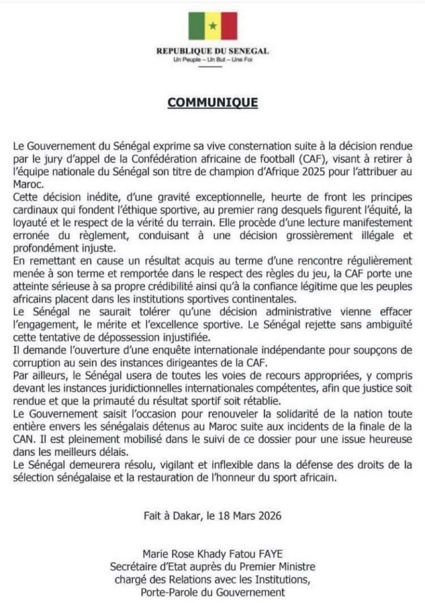 Le gouvernement du Sénégal a condamné, ce mercredi 18 mars 2026, dans un communiqué publié sur le réseau social X(ancien twitter), la décision rendue , mardi 17 mars, par le jury d’appel de la Confédération africaine de football (CAF) concernant la finale de la CAN 2025, décision qui retire au Sénégal son titre de champion d'Afrique au profit du Maroc.