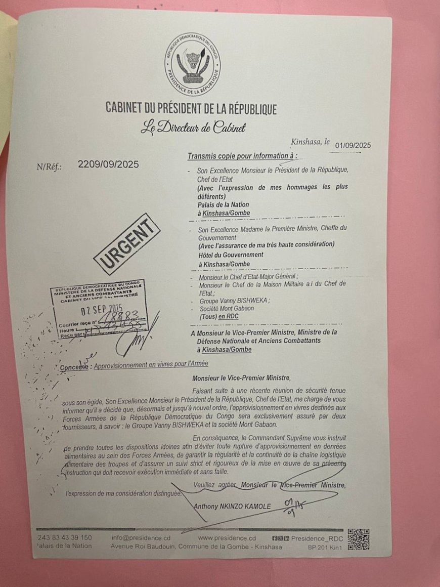 Le Directeur de cabinet du Président de la République, Anthony NKINZA a, dans une correspondance, datant du 01 septembre 2025, écrit au vice-Premier Ministre, ministre de la Défense nationale, lui demandant de tout mettre œuvre afin qu'il n'y ait pas rupture d'approvisionnement en denrées alimentaires au sein des Forces armées de la République démocratique du Congo.