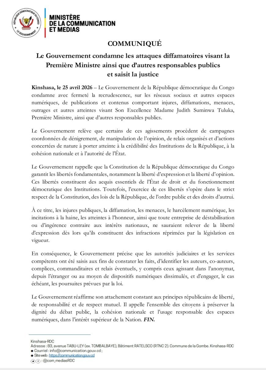 Le Gouvernement de la République démocratique du Congo condamne avec fermeté, dans un communiqué rendu public ce samedi 25 avril, la recrudescence, sur les réseaux sociaux et autres espaces numériques, de publications et contenus comportant injures, diffamations, menaces, outrages et autres atteintes à l'endroit de sa Cheffe Madame Judith Suminwa Tuluka, Première Ministre, ainsi que d’autres responsables publics.